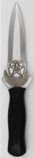 This athame is a marvelous piece to add to the mystery of your ritual and worship. With a black, 3 3/4" handle carved of wood and metal to comfortably fit the curve of your palm, it presents a 4 1/2" blade, finely crafted of stainless steel. Flaring out at the base into a curved cross guard, often referred to as wings, it is decorated with the upturned moon and pentagram that are viewed as a symbol for Hecate, the goddess of magick, the underworld, and crossroads. Often known as the crone goddess, or otherwise seen as a potent force in mystery and magick, her symbol and blessing upon this athame make it a potent addition to your rituals. This athame comes with a black leather sheath that snaps closed around the athame`s handle to hold it firmly in place and has a loop to allow it to be affixed to your belt.